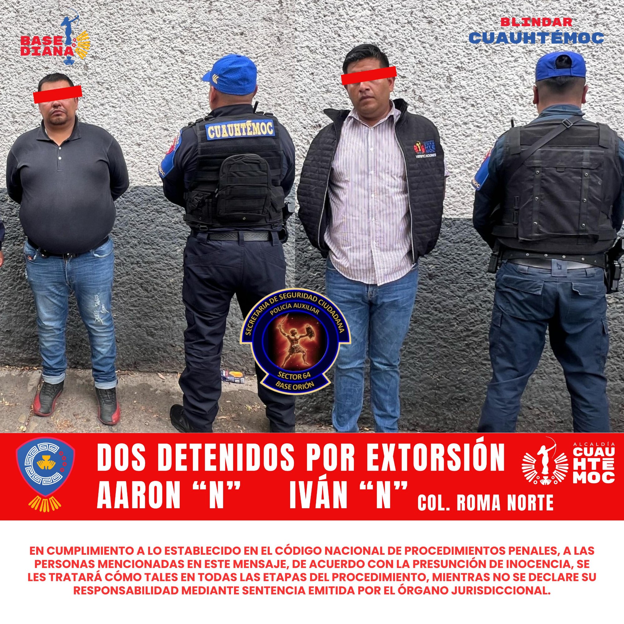 Fueron detenidos en flagrancia a dos personas señaladas por el delito de extorsión, quienes presuntamente se hacían pasar por verificadores del Gobierno de Cuauhtémoc para exigir dinero a encargados de una obra en construcción ubicada en la colonia Roma Norte.