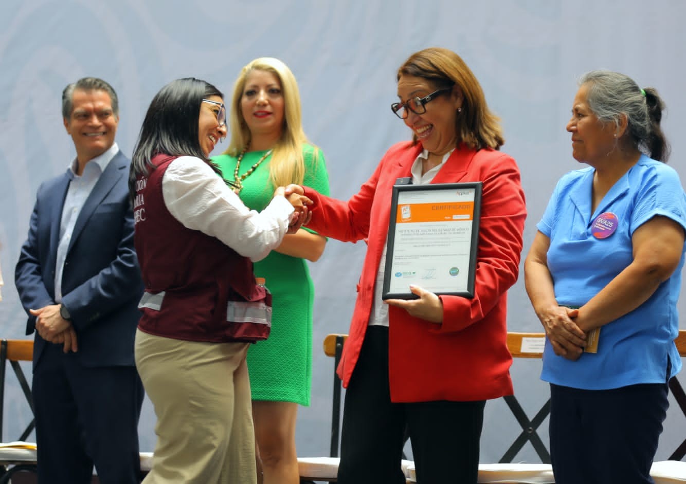 Durante este acto las autoridades de salud entregaron Certificados ISO 9001:2015 a la Subdirección de Recursos Materiales de la Coordinación de Administración y Finanzas del Instituto de Salud del Estado de México (ISEM) por contar con adecuados estándares de calidad en las áreas de almacenamiento de vacunas, lo que impacta en una mayor eficiencia en la cadena de suministro de las dosis