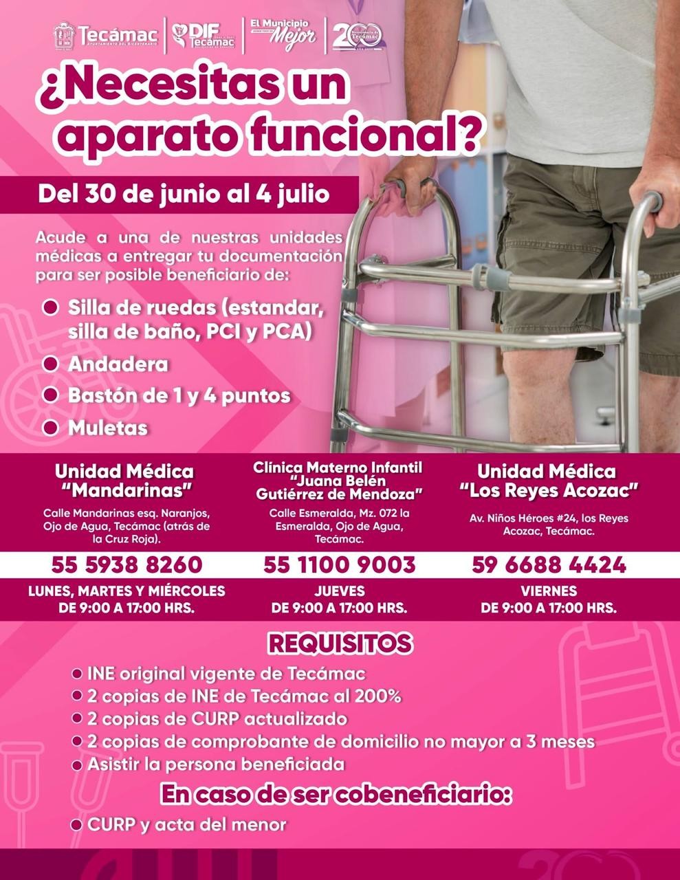 A partir de este lunes y hasta el próximo viernes, el Sistema Municipal #DIF de Tecámac recibirá los documentos para solicitar la entrega de aparatos funcionales, como sillas de ruedas (estándar, sillas de baño, PCI y PCA), andadera, bastón de uno y cuatro puntos y muletas. Los interesados tienen que ser residentes de Tecámac y deberán entregar original y dos copias del INE, del CURP actualizado, y de comprobante de domicilio no mayor a tres meses.