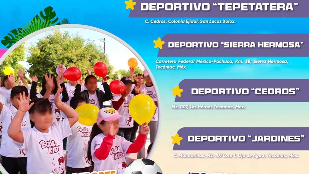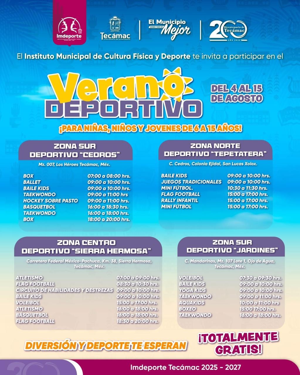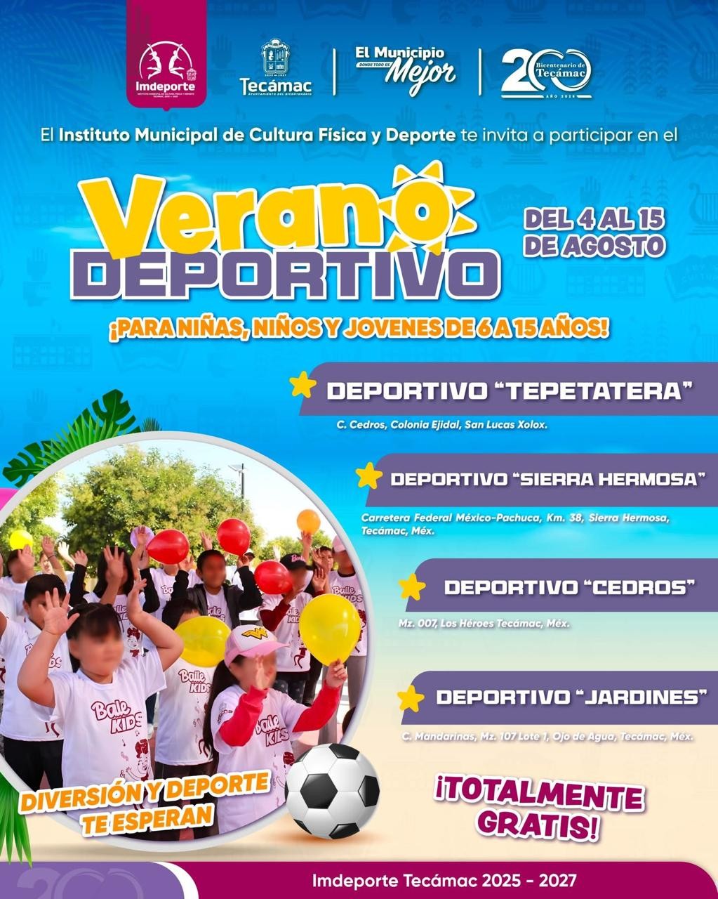 El gobierno de Tecámac, a través del Instituto Municipal de Cultura Física y Deporte (Imdeporte), llevará a cabo el “Verano Deportivo” para menores de entre 6 y 15 años, en el que podrán participar en distintas disciplinas.