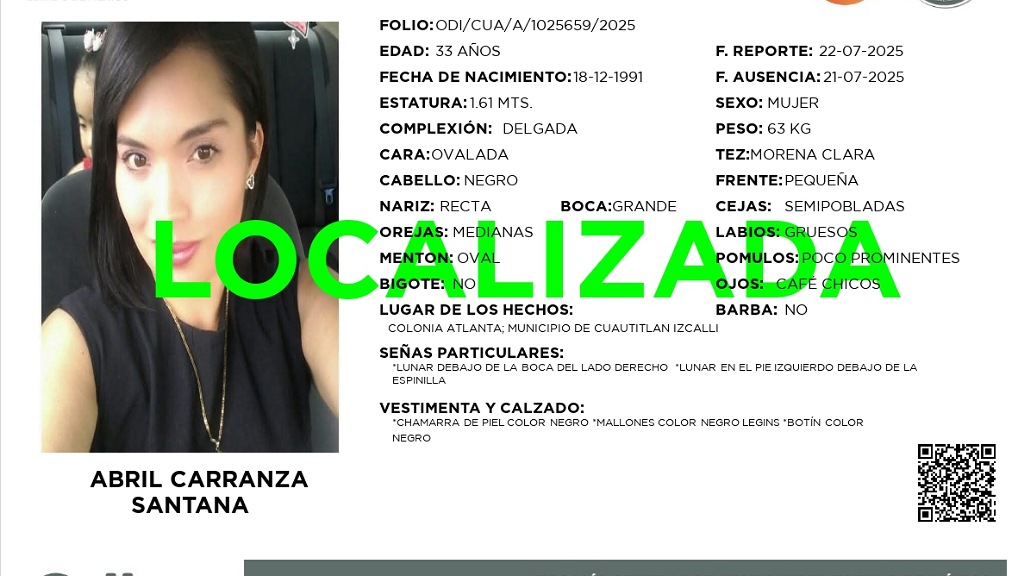 La Policía de Género y la Célula de Búsqueda de Personas de Cuautitlán Izcalli, en coordinación con la Fiscalía de Personas Desaparecidas del Estado de México, logró la reintegración al núcleo familiar de Abril Carranza Santana, persona reportada como desaparecida y con ficha de búsqueda emitida el lunes pasado.