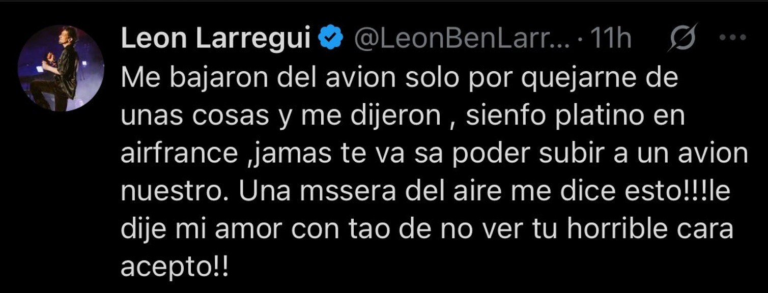 El reconocido cantante mexicano León Larregui, vocalista de la banda Zoé, se vio envuelto en una polémica tras ser bajado de un avión de AirFrance debido a un altercado con una sobrecargo. Según relató el propio artista en redes sociales, el incidente ocurrió cuando se quejo del servicio mas siendo el un cliente platino, a lo que una azafata le informó que nunca volvería a volar con la aerolínea. Larregui respondió de manera contundente: «Con tal de no ver tu horrible cara», desatando una ola de reacciones en la plataforma X.