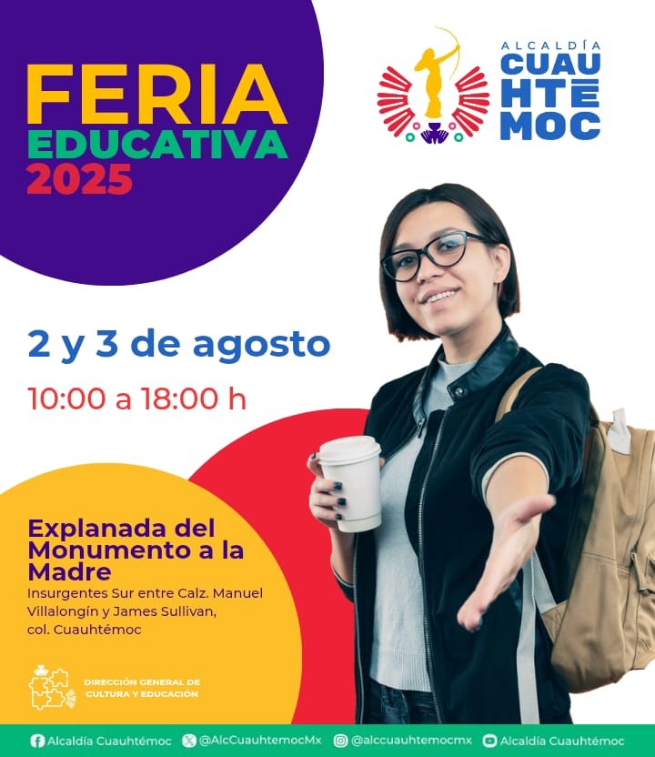 Este 2 y 3 de agosto, la explanada del Monumento a la Madre será sede de la Feria Educativa Cuauhtémoc 2025, organizada por la administración que encabeza la alcaldesa Alessandra Rojo de la Vega, a través de la Dirección General de Cultura y Educación.