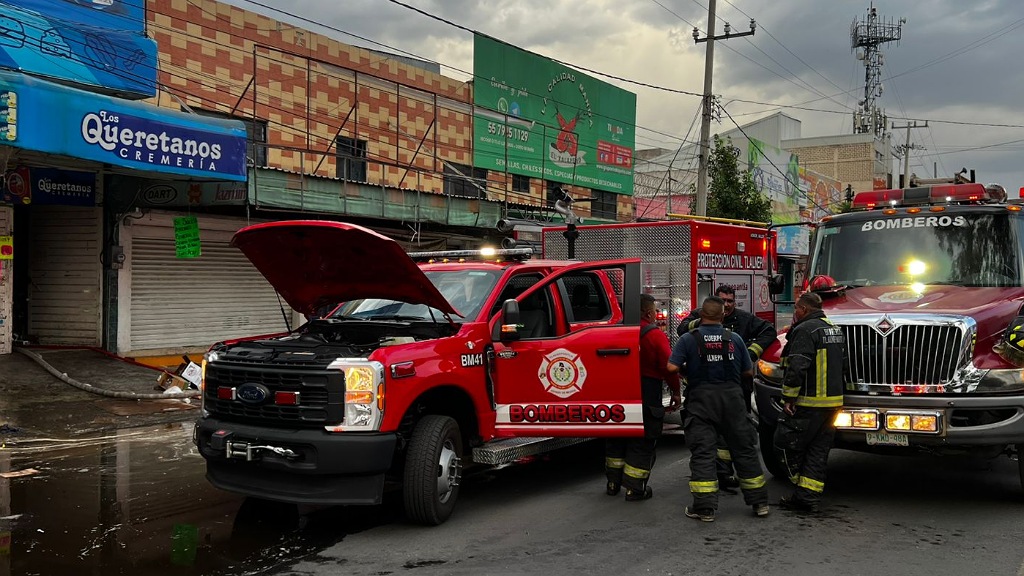 Los Bomberos de Tlalnepantla atienden un incendio al interior de una bodega ubicada en Avenida Radial Toltecas y Zumpango, Habitacional La Romana.