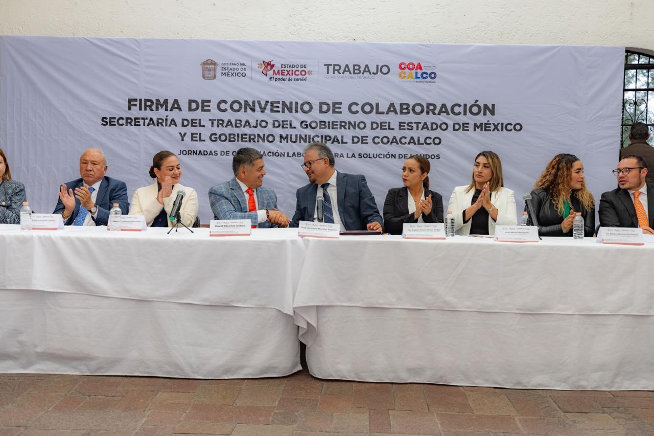 La firma del convenio se llevó a cabo en la Casa de Cultura Calmécac y contó con la presencia de: Janet Minutti Rodríguez, Presidenta de la Sala Auxiliar de Tlalnepantla; Octavio Peñaloza Lugo, Secretario Particular de la Secretaría del Trabajo del Gobierno del Estado de México; Rebeca Montoya Rodríguez, Directora Jurídica de Coacalco; Ángeles Yasmín Dimas Vargas, Secretaria del Ayuntamiento; Manuel Huicochea Cárdenas, Tesorero Municipal; Karen Báez Melo, Síndico Municipal; y María de Lourdes González Ocampo, Presidenta Honorífica del DIF Coacalco.