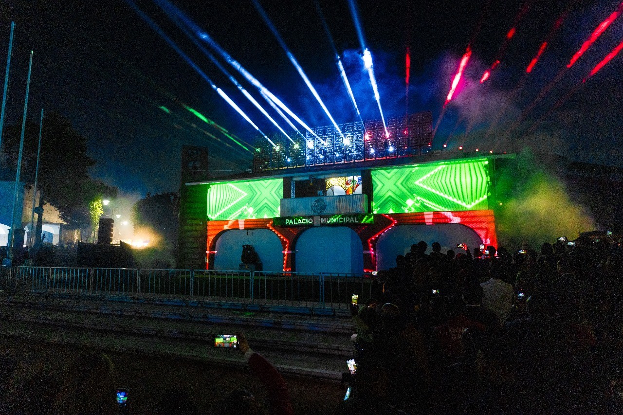 Previo al Grito de Independencia, los asistentes disfrutaron de un videomapping que iluminó la fachada del Palacio Municipal con imágenes alusivas a la historia de México.