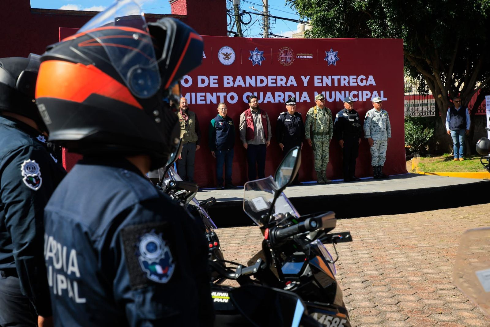 En presencia de autoridades de los tres órdenes de gobierno, así como servidores públicos municipales, en el Parque conocido como Las Cuevitas, el presidente municipal llevó a cabo el Izamiento de Bandera y la entrega de equipamiento a las y los elementos. Frente a la Biblioteca Municipal, se concentraron elementos de la Guardia Municipal de Naucalpan, la Guardia Nacional, el Ejército Mexicano (SEDENA) y la Policía Estatal a quienes el alcalde les reconoció su labor al disminuir los índices de violencia en el municipio.