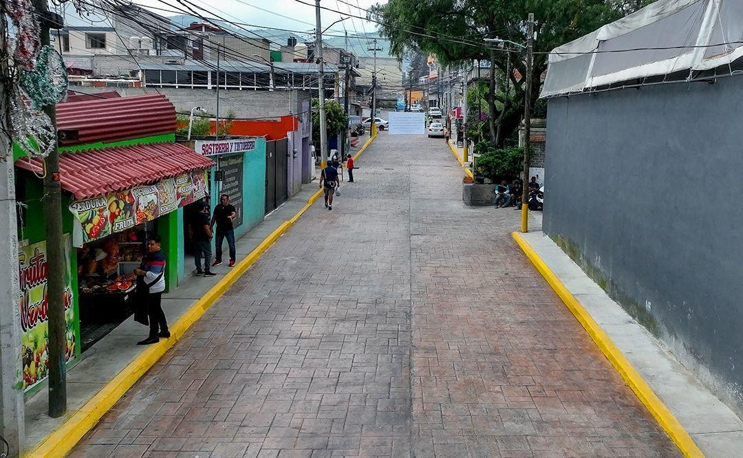 Los trabajos se realizaron en un tramo de 284 metros lineales y un área total de 2,761 metros cuadrados. Las labores incluyeron la demolición de la antigua carpeta asfáltica para sustituirla por una nueva superficie de rodamiento con concreto hidráulico estampado de 15 cm de espesor, lo que garantiza una mayor durabilidad. Adicionalmente, se construyeron guarniciones y banquetas nuevas, se instalaron luminarias de tipo colonial para mejorar la seguridad nocturna y se colocaron reductores de velocidad para fomentar un tránsito vehicular más seguro para los peatones.