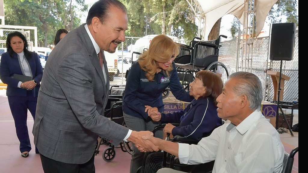 Gracias a la buena gestión del DIF y al compromiso de ciudadanos solidarios con la salud y las necesidades de la comunidad, en esta ocasión se realizó la donación de 100 sillas de ruedas al SMDIF por parte del Lic. Mario Arturo Gómez Rodríguez, quien felicitó la labor del Presidente Municipal, Pedro Rodríguez Villegas, y de la Presidenta Honoraria del DIF, Paty Arévalo.