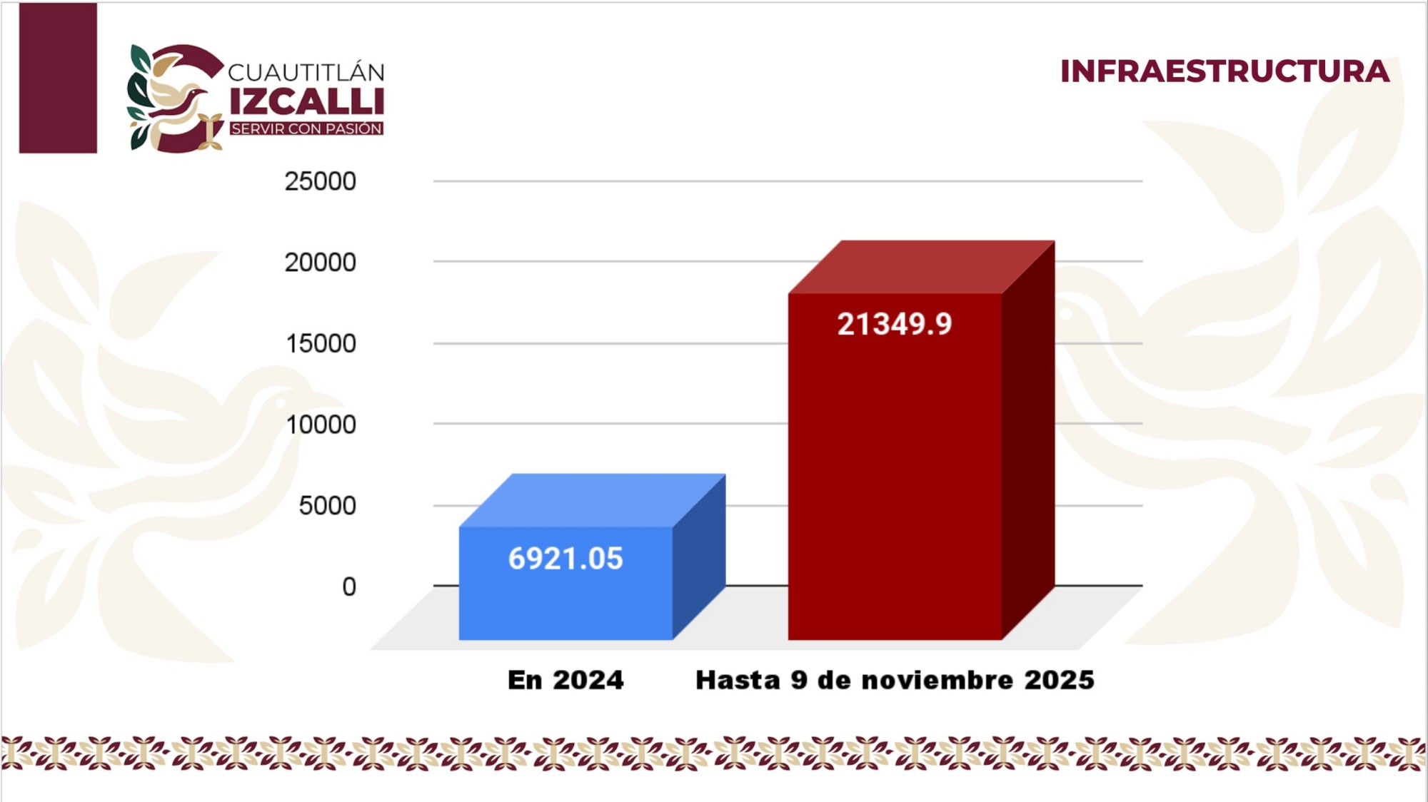 El Gobierno Municipal de Cuautitlán Izcalli triplicó la meta de asfaltado en 2025, alcanzando las 21 mil 350 toneladas de mezcla asfáltica, tendidas durante los primeros 10 meses de la administración, encabezada por el alcalde Daniel Serrano, a diferencia de las 6 mil 921.5 toneladas colocadas durante todo el 2024; “en tan sólo 10 meses hemos triplicado la cifra de lo colocado en 2024, es algo de lo que estamos muy orgullosos; es algo que sí tenemos que reconocer.