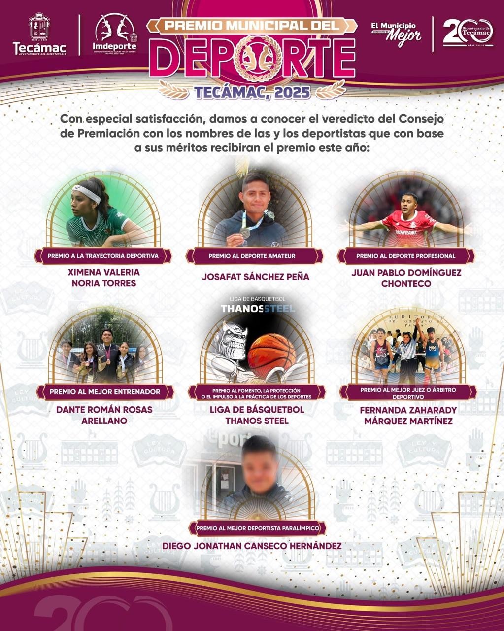 El Gobierno de Tecámac, a través del Instituto Municipal de Cultura Física y Deporte (Imdeporte), dio a conocer a los ganadores del Premio Municipal del Deporte en su edición 2025, en 7 distintas categorías, que serán entregados el 19 de noviembre en el marco de la conmemoración del 115 aniversario de la Revolución Mexicana.