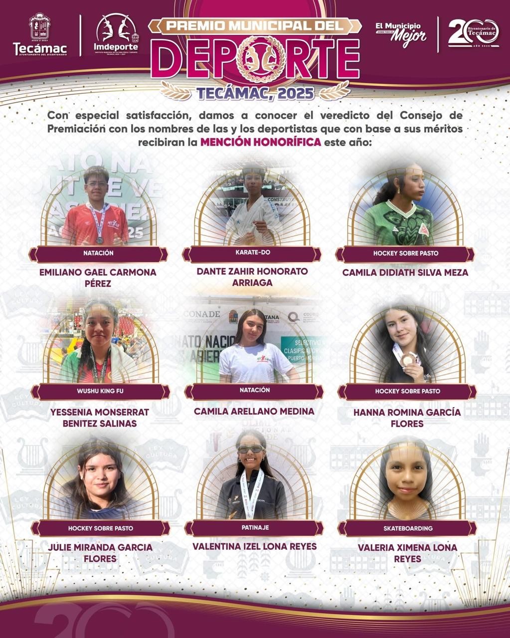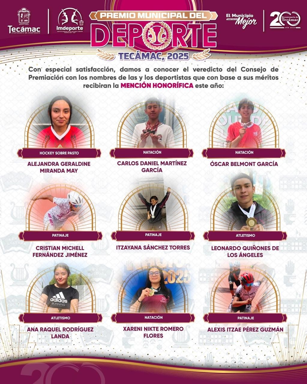 Asimismo, se otorgarán hasta 35 menciones honoríficas, acompañadas de un estímulo económico de 10 mil pesos a cada una, para ampliar el reconocimiento a los atletas que han contribuido al desarrollo del deporte tecamaquense.