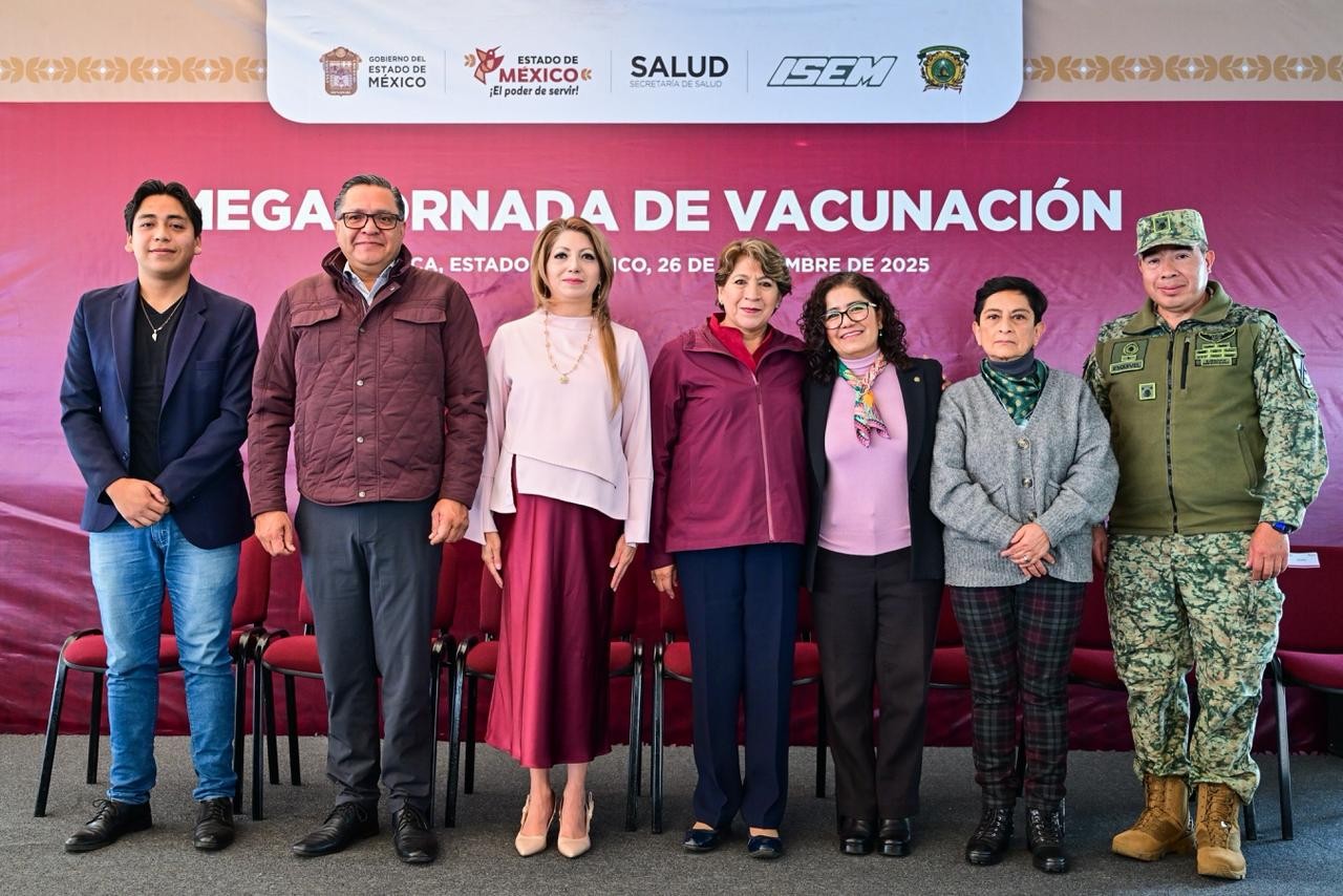 La Gobernadora Delfina Gómez Álvarez encabezó la inauguración de la Megajornada de Vacunación organizada por la Universidad Autónoma del Estado de México (UAEMéx) y la Secretaría de Salud del Gobierno estatal, una acción que prevé aplicar más de 46 mil dosis de biológicos contra influenza, COVID-19, neumococo, sarampión y diversas vacunas del cuadro básico para niñas, niños y adolescentes.