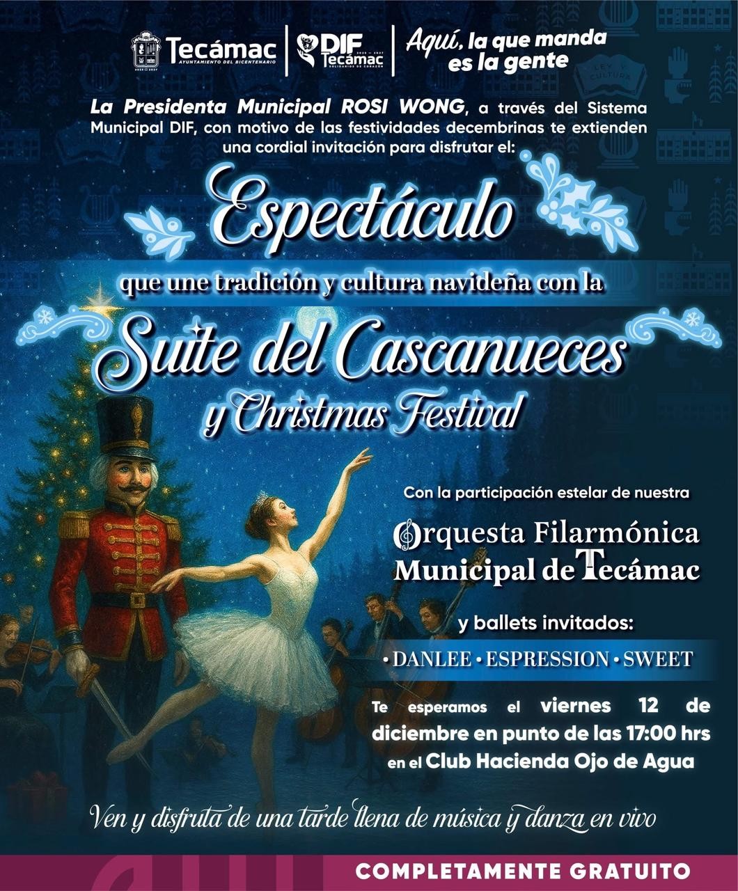 De forma totalmente gratuita, los habitantes disfrutarán del Espectáculo Navideño de la Suite del Cascanueces y del Christmas Festival, con la participación de la Orquesta Filarmónica Municipal de Tecámac, acompañada por los ballets Danlee, Expression y Sweet. Ambos eventos se llevarán a cabo el próximo 12 de diciembre en el Club Hacienda Ojo de Agua, a partir de las 17:00 horas, y no es necesario registrarse.
