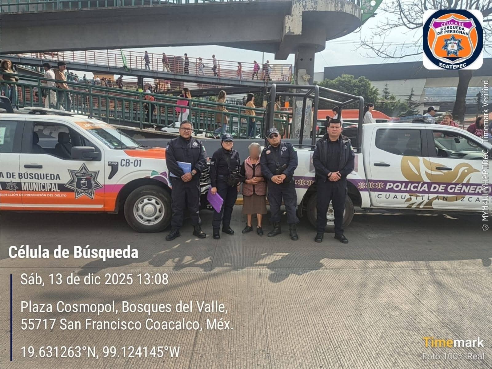 Elementos de la Unidad de Género localizaron a la mujer, quien se encontraba desorientada, por lo que de inmediato activaron a la Célula de Búsqueda. La adulta mayor fue ubicada en el municipio de Coacalco de Berriozábal y manifestó ser originaria de Cuautitlán Izcalli, lo que permitió iniciar de forma inmediata las acciones para localizar a sus familiares.