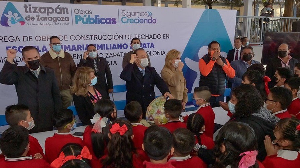 Con la entrega de arcotechos, aulas digitales y núcleos sanitarios, su administración impulsa infraestructura digna y moderna que garantiza mejores condiciones de aprendizaje. En la primaria Emiliano Zapata, ubicada en la colonia del mismo nombre, el alcalde (acompañado por la Presidenta Honoraria del DIF Municipal, Paty Arévalo) entregó un arcotecho que permitirá al alumnado realizar actividades físicas y cívicas con mayor seguridad.
