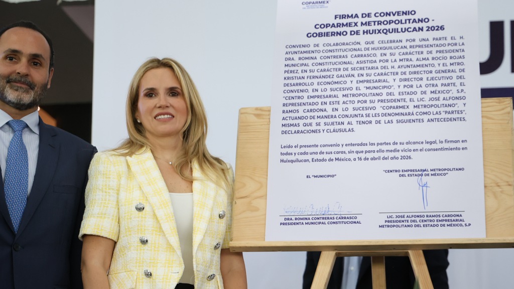 La presidenta municipal Romina Contreras firmó un convenio de colaboración con Coparmex Metropolitano para impulsar el desarrollo económico de Huixquilucan, atraer nuevas inversiones y generar más empleos en beneficio de la población.